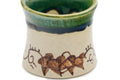 Oribe-yaki (織部焼) is a type of Japanese pottery known for its free flowing glazes and asymmetrical, hand-formed shapes. Dating in the late 16th century, Oribe ware takes its name from legendary tea master Furuta Oribe (古田 織部) who is believed to have played a large part in its development. Oribe wares are decorated with abstract designs and splashes of free-flowing vibrant green or deep black glaze. With these distorted shapes and novel decorations, Oribe-yaki exudes a charm that matches Furuta Oribe’s philosophy of hyouge (へうげ) or playfulness. One of the most popular styles of Oribe ware is Ao-Oribe or Green Oribe, which is decorated with geometric patterns painted with an iron glaze and then partially covered in a vibrant green copper-sulfate glaze which contrasts against the light background.