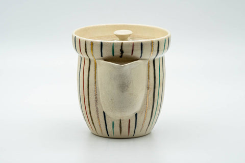 This large houhin (handleless teapot) features a beige glaze decorated with multi-coloured vertical stripes across its body and lid.. Like most houhin, this teapot has a simple built-in ceramic do-ake filter.