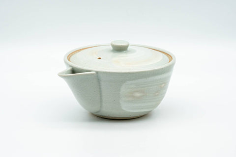 This houhin (handleless teapot) features a grey glaze decorated with a white hakeme brush stroke glaze. This houhin has a built-in ceramic debeso filter to naturally strain tea.