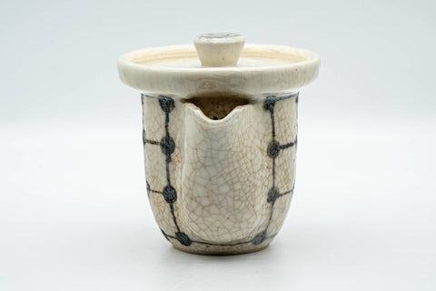 This large houhin (hohin; handle-less teapot) features a cream-white crazed glaze decorated with a checkered grid pattern around its body. This teapot's built-in ceramic do-ake filter is perfect for naturally straining tea.