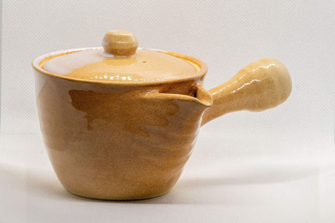 This Hagi-yaki kyusu (teapot) is made like a houhin, meaning that it has a wide, triangular open spout which allows for fast pouring, a simple ceramic do-ake filter which lends no metallic taste to the tea, and a wide opening which allows for easy viewing of the tea leaves and easy cleaning. This kyusu is made from a warm, orange-hued stoneware with white glazing,