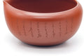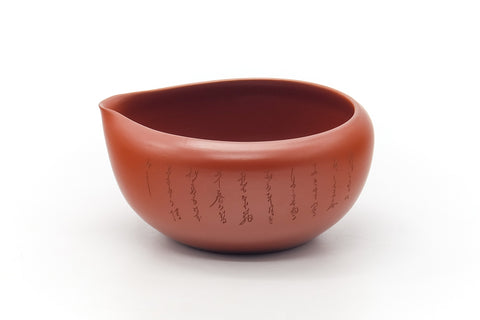 This Tokoname katakuchi (yuzamashi; water cooler) is thrown from the iconic Tokoname shudei (朱泥) clay, known for its brilliant red colour and ability to subtly reduce the astringency of tea. Its exterior features beautiful engraved calligraphy.