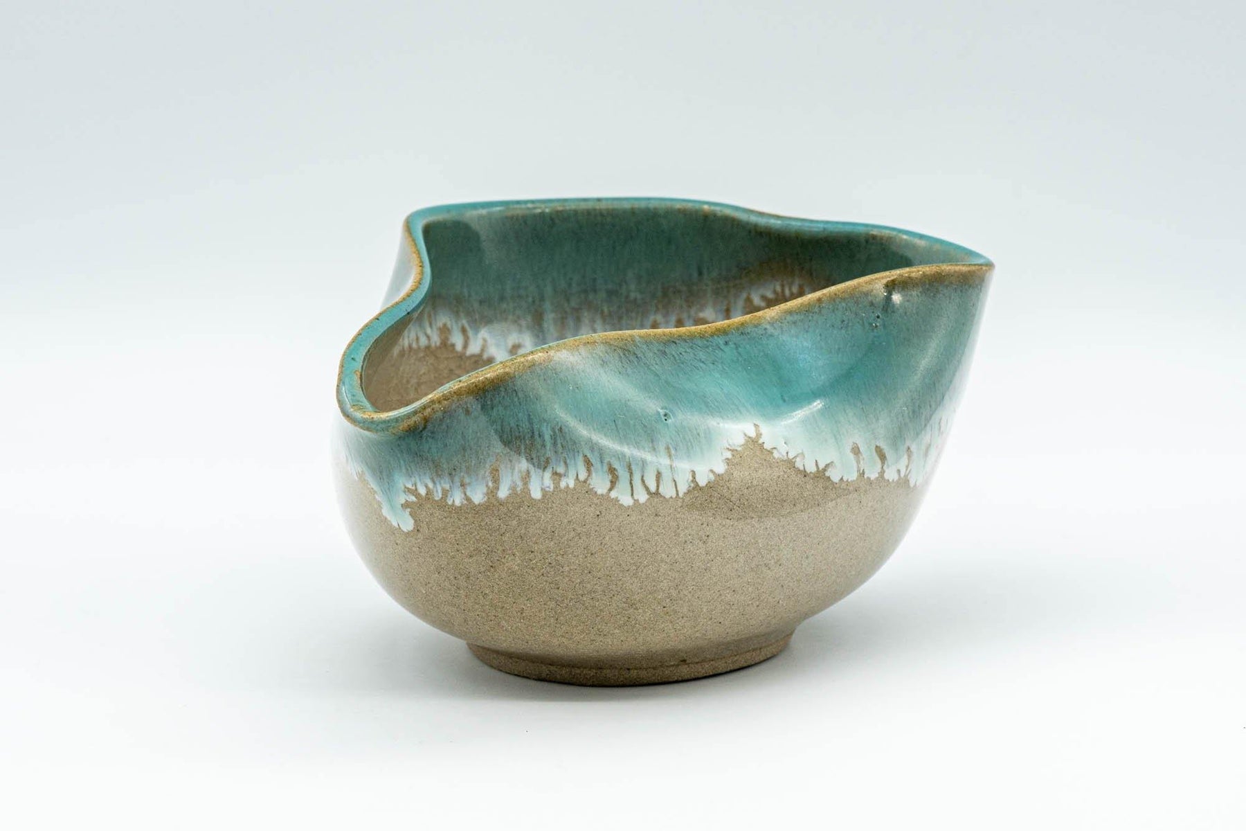 This Agano-yaki handleless yuzamashi (water cooler, also called a katakuchi) features a stunning turquoise enamel glaze.