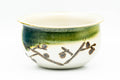 This small Oribe-yaki kensui (water waste bowl) features a beige and green glaze decorated with abstract geometric patterns.