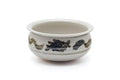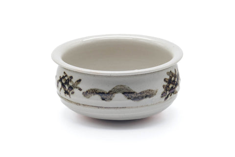This kensui (water bowl for tea ceremony) features a white glaze decorated with abstract motifs.Dimensions:13.7cm (5.4in) - width6.5cm (2.6in) - height525ml - capacityCondition: Very goodThis vintage Japanese item ships from Thailand.