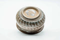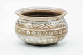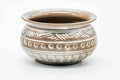 This kensui (waste water bowl for tea ceremony) is decorated in the Korean mishima style with a brown glaze accented with floral motifs made with white slip inlay.