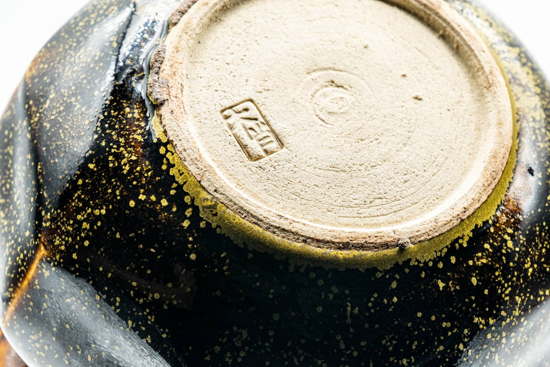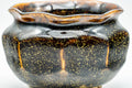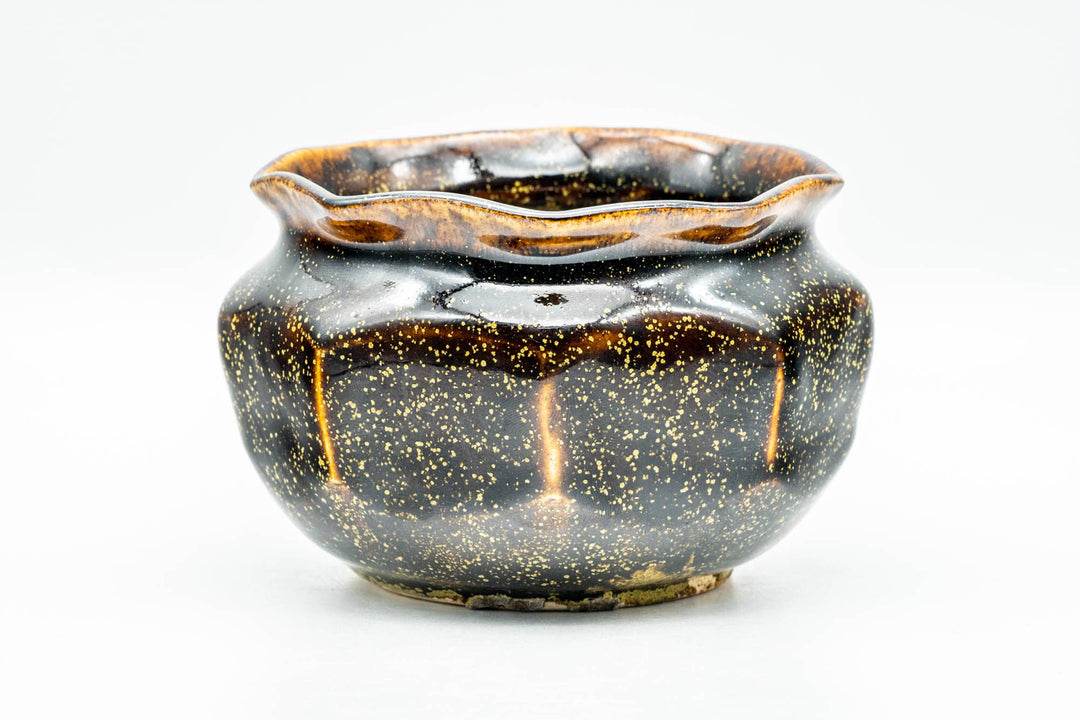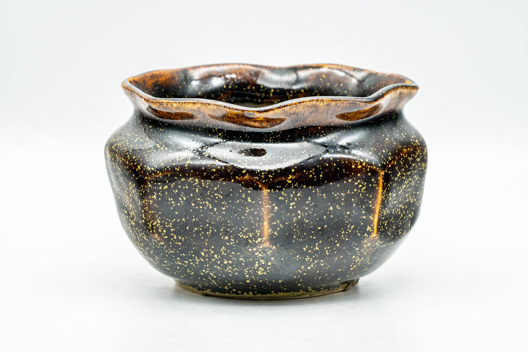 This small kensui (waste water bowl) features a crowned lip with a decorative flare, and a speckled black-brown glaze.