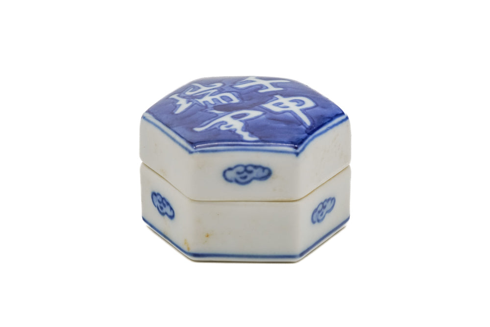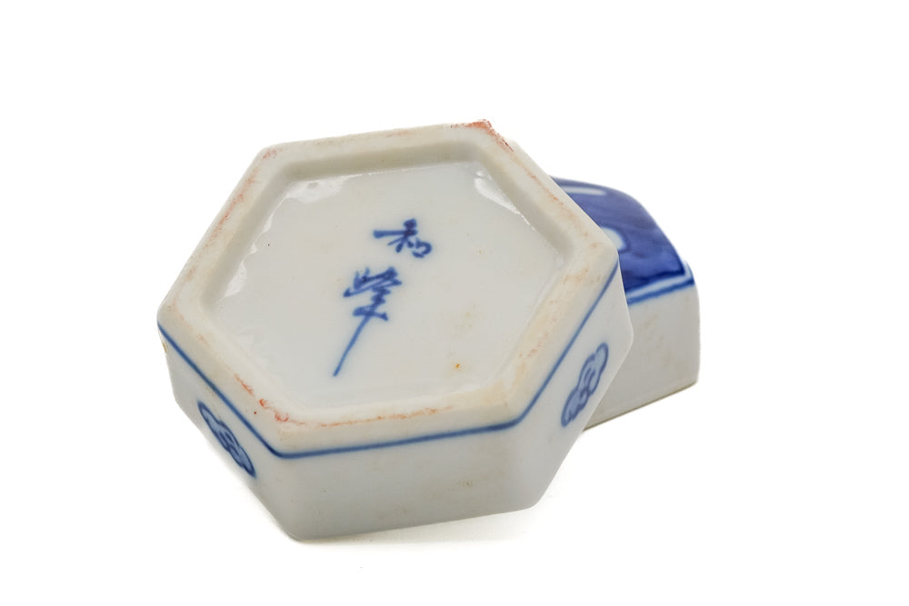 This porcelain kōgō (香合 - incense container) is made in a hexagonal shape and decorated in the sometsuke (染付 - blue and white porcelain) style with cloud motifs and the characters 壬申 瑞雲 which translate to "Water Monkey" (the Years of the Monkey 1932, 1992, 2052, etc.) and "Auspicious Clouds"