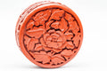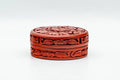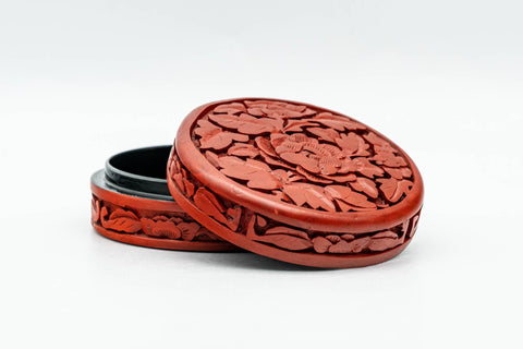 This Japanese kogo (incense container) is made from red lacquered wood, decorated wit ha carved camellia in the Ming dynasty Chinese style.