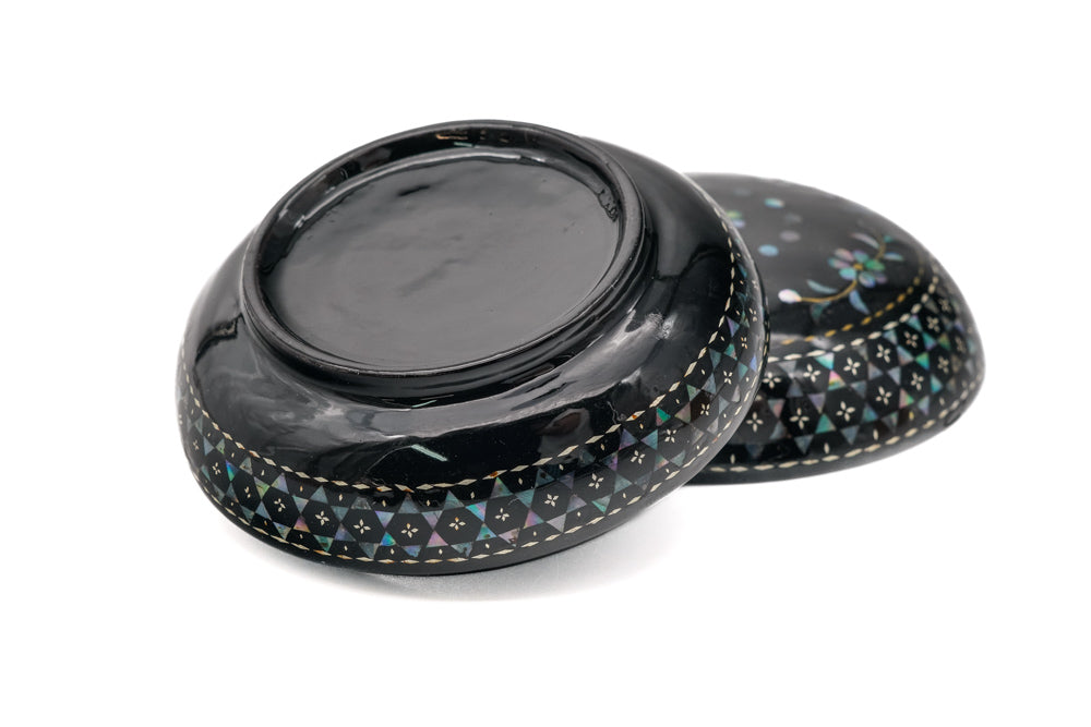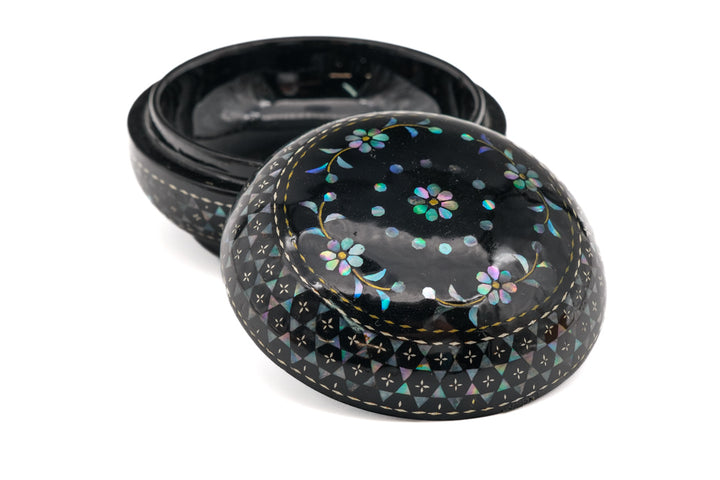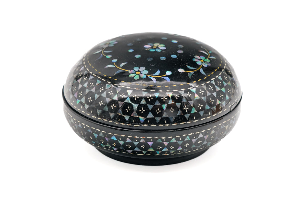 This lacquer kōgō (香合 - incense container) is decorated using the traditional raden (螺鈿 - mother of pearl inlay) technique, with geometric and floral patterns dancing across the piece in shimmering iridescent colours.