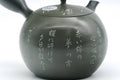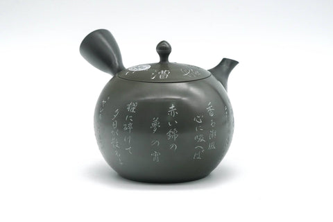 This wonderful Tokoname-yaki kyusu (teapot) made green ryokudei (緑泥) clay and engraved with calligraphy. Its built-in ceramic sasame filter is perfect for naturally straining tea.