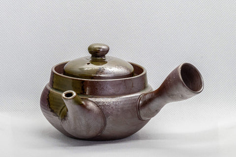 This Banko-yaki kyusu (teapot) comes with a fine mesh strainer and is decorated with patches of green ash glaze.