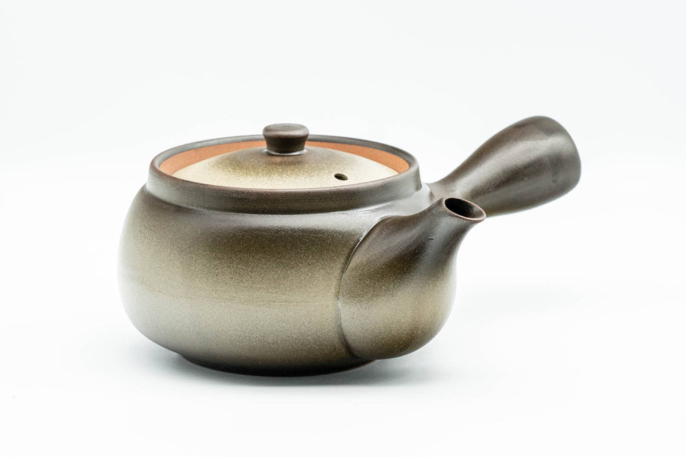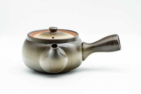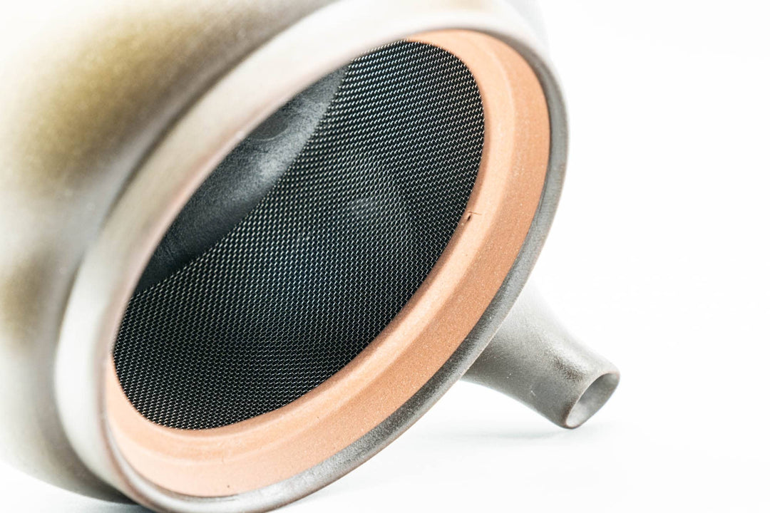 This large kyusu (teapot) features a textured black and brown glaze. Its obi-ami filter made of fine stainless steel mesh that wraps around the entire inside of the pot.