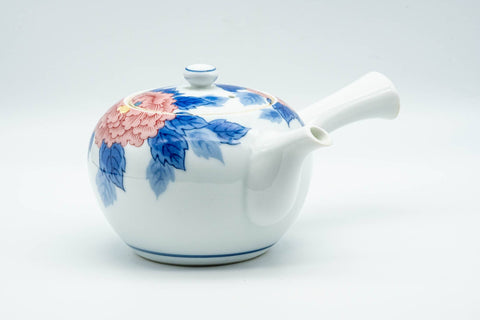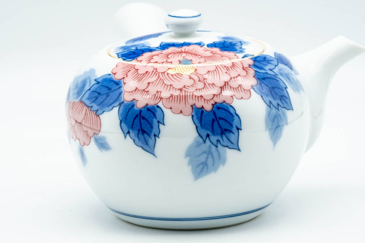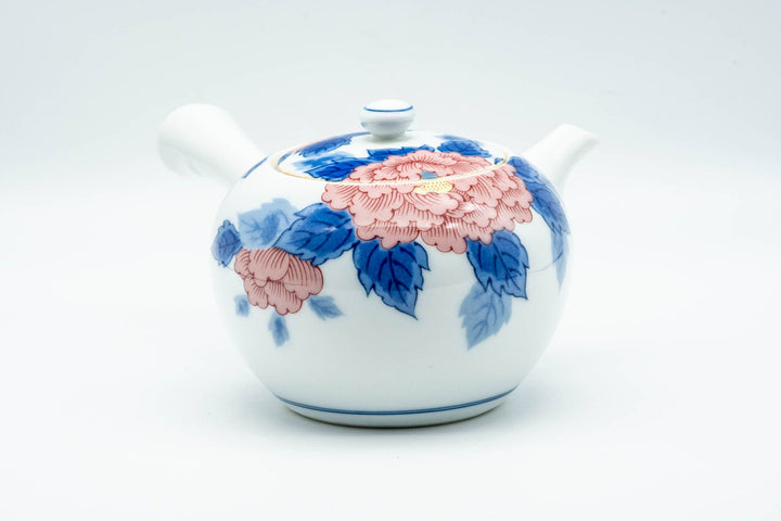 This Arita-yaki kyusu (teapot) features white porcelain decorated with blue and pink flowers. Its built-in ceramic debeso filter is perfect for naturally straining tea.