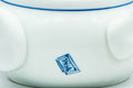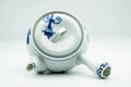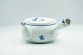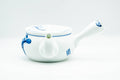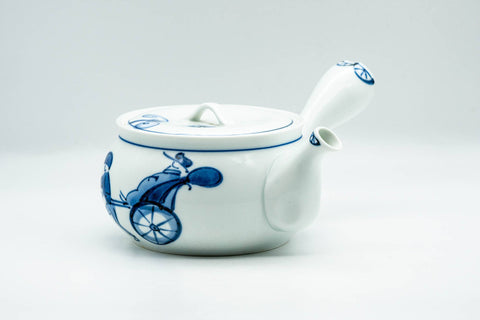 This white porcelain Arita-yaki kyusu (teapot) sports blue motifs featuring a lamp and rickshaw carriage. Its built-in ceramic debeso filter is perfect for naturally straining tea.