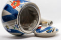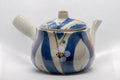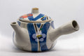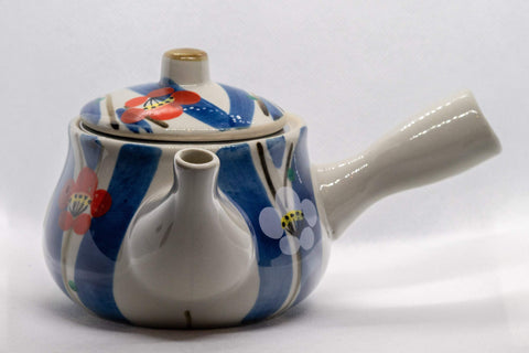 Vintage side-handle Japanese kyusu (teapot) with a basket infuser. This teapot is decorated with blue stripes overlayed with blue and red flowers. The base of the kyusu reads いろは.