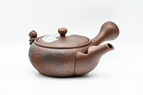 This mould-made Tokoname-yaki kyusu (teapot) features an brown glade and an atypical design. It's airflow comes from the owl perched on the back of the pot, rather than through the lid, and it's bottom-sitting mesh nozomi filter aids with a fast pour.