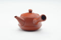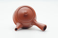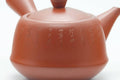 This Tokoname-yaki kyusu (teapot) is made from red shudei clay and features hand-engraved calligraphy. Its clamped-on mesh debeso filter is perfect for brewing even the most deeply-steamed fukamushi senchas.