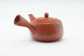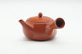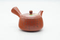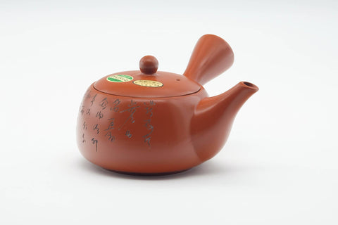 This Tokoname-yaki kyusu (teapot) is made from red shudei clay and features hand-engraved calligraphy. Its mesh strainer is perfect for brewing even the most deeply-steamed fukamushi senchas.