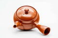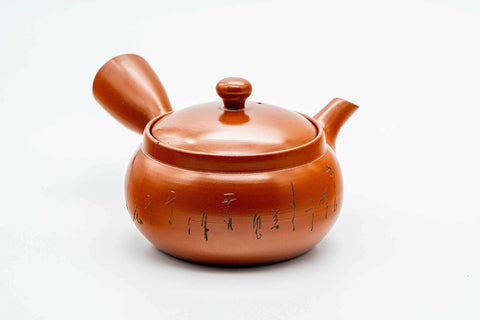 This Tokoname-yaki kyusu (teapot) features calligraphy engraved in red shudei clay. Its mesh strainer is perfect for brewing even the most deeply-steamed fukamushi senchas.