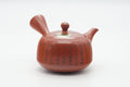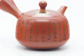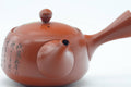 This Tokoname-yaki kyusu (teapot) is made from red shudei clay and features hand-engraved calligraphy. Its mesh strainer is perfect for brewing even the most deeply-steamed fukamushi senchas.