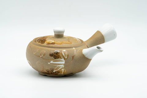 This porcelain kyusu (teapot) features a textured beige glaze and a fine mesh strainer.