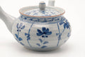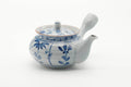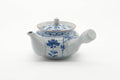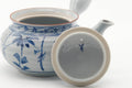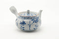 This Arita-yaki kyusu (teapot) is made from white-grey porcelain and decorated with blue patterned trim and flowers. Its built-in ceramic debeso filter is perfect for naturally straining tea.