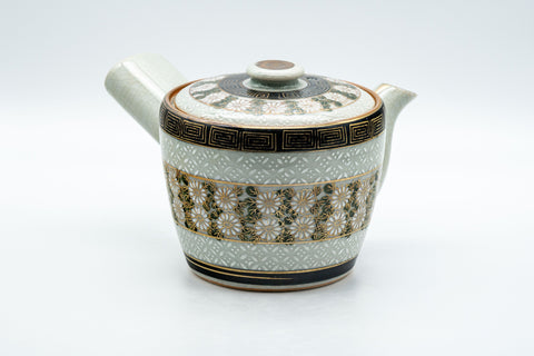This Kutani-yaki porcelain kyusu (teapot) features a crazed white glaze decorated with gilded chrysanthemums.