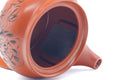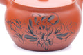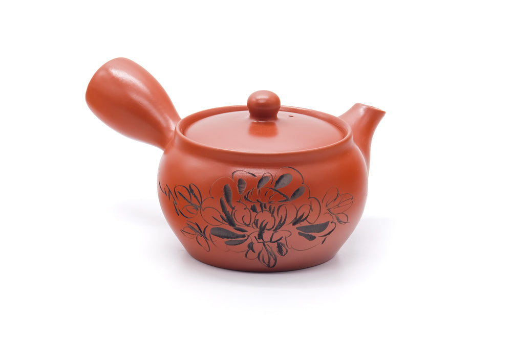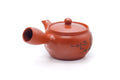 This mould-made Tokoname-yaki kyusu (teapot) features red shudei clay engraved with a floral motif.