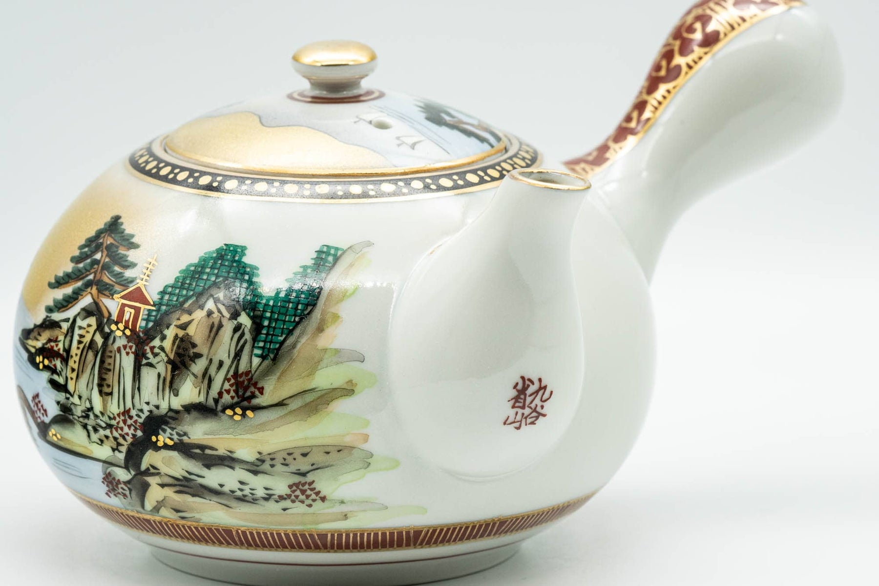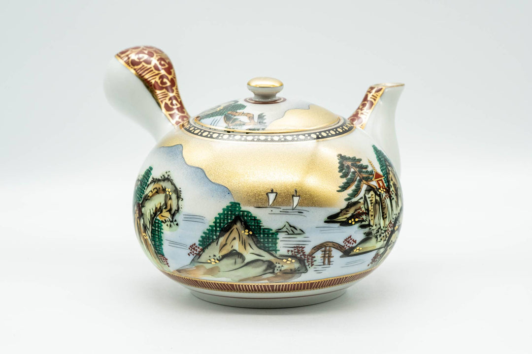 This Kutani-yaki kyusu (teapot) features a wonderful mountainous scene of village surrounding a river, decorated with gold and red patterns. Its ceramic debeso (half-spherical) filter introduces no metallic flavours to the tea.