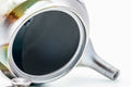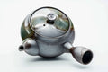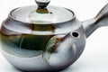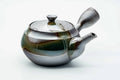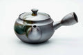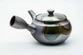 This large Banko-yaki kyusu (teapot) features a webbed ash green glaze over purple clay. Its mesh strainer is perfect for brewing even the most deeply-steamed fukamushi senchas.