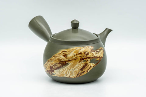 This delightful nasu-gata Tokoname-yaki kyusu (teapot) is made from ryokudei (緑泥), which is a type of Tokoname clay that turns green when fired, due to added cobalt. This soft green clay is accented by a patch of red, white, and yellow nerikomi clay.