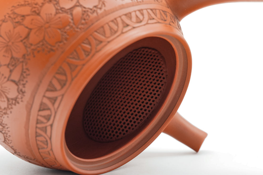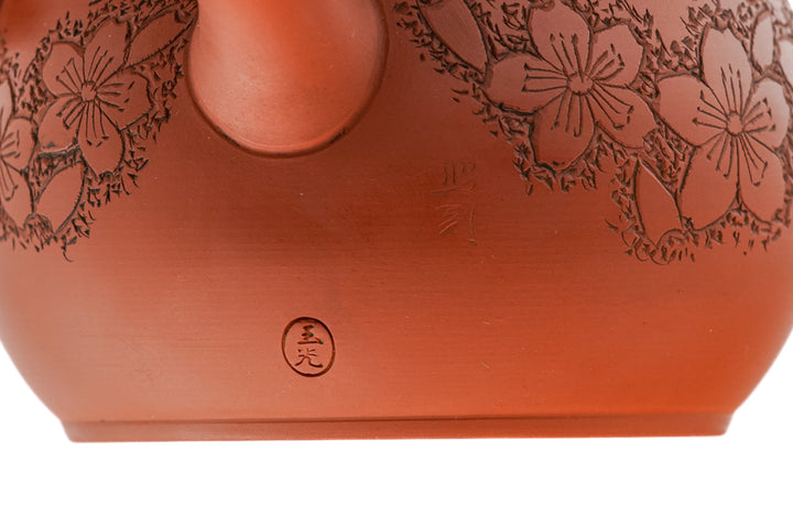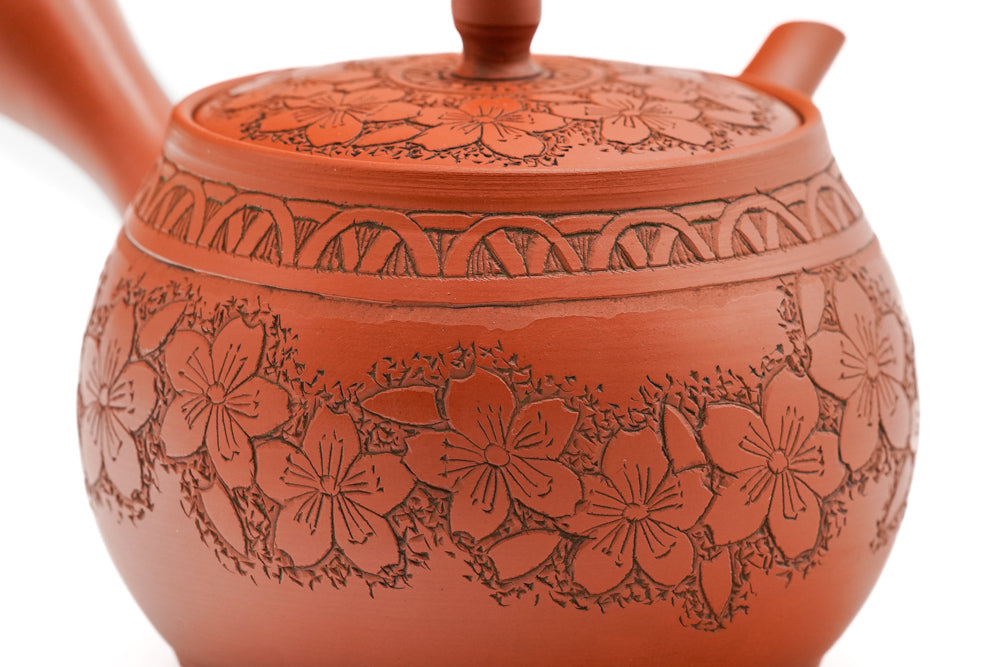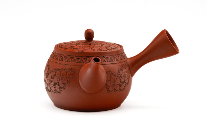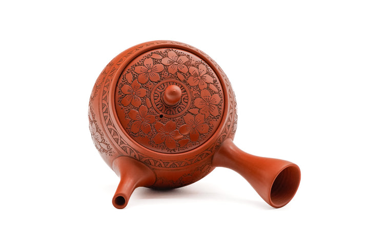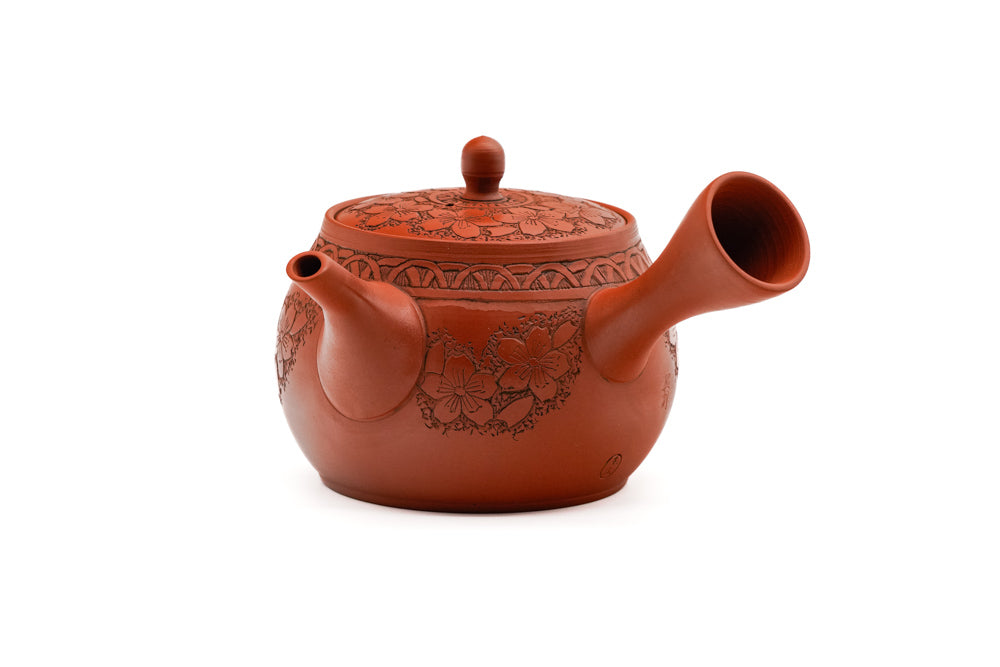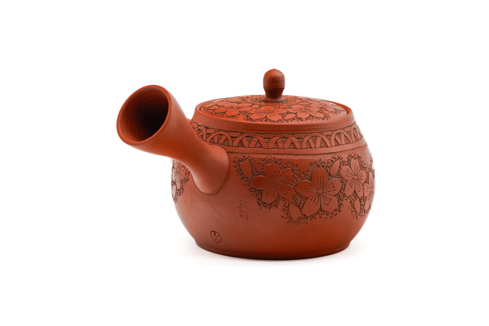 GyokkoThis expertly crafted Tokoname-yaki kyusu (teapot) is made from the iconic Tokoname shudei (朱泥) clay, known for its brilliant red colour and ability to subtly reduce the astringency of tea. The body is decorated with a masterfully delicate engraving of sakura (桜 - cherry blossoms).