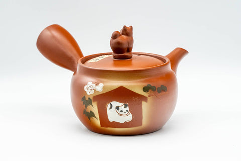 This mould-made Japanese Tokoname-yaki kyusu (teapot) features a smooth red clay and a lid handle shaped as a cat.