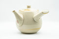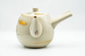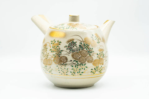 This large Kutani-yaki kyusu (teapot) is decorated with gold flowers. Its built-in ceramic debeso filter is perfect for naturally straining tea.