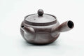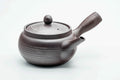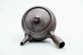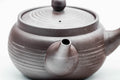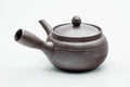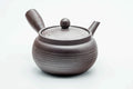 This large Banko-yaki kyusu (teapot) features an unglazed clay body with spiraling horizontal grooves.