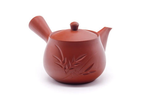 This Tokoname-yaki kyusu (teapot) is made from red shudei clay and engraved with a long grass motif. Its built-in ceramic debeso filter is perfect for naturally straining tea.