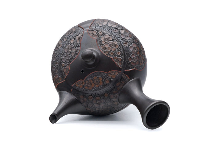 The body is decorated with a intricately carved plum blossoms, accentuated in the shudashi (朱出し) style, in which a thin layer of the blackened clay is scraped off, revealing the brilliant vermillion of the shudei clay underneath.