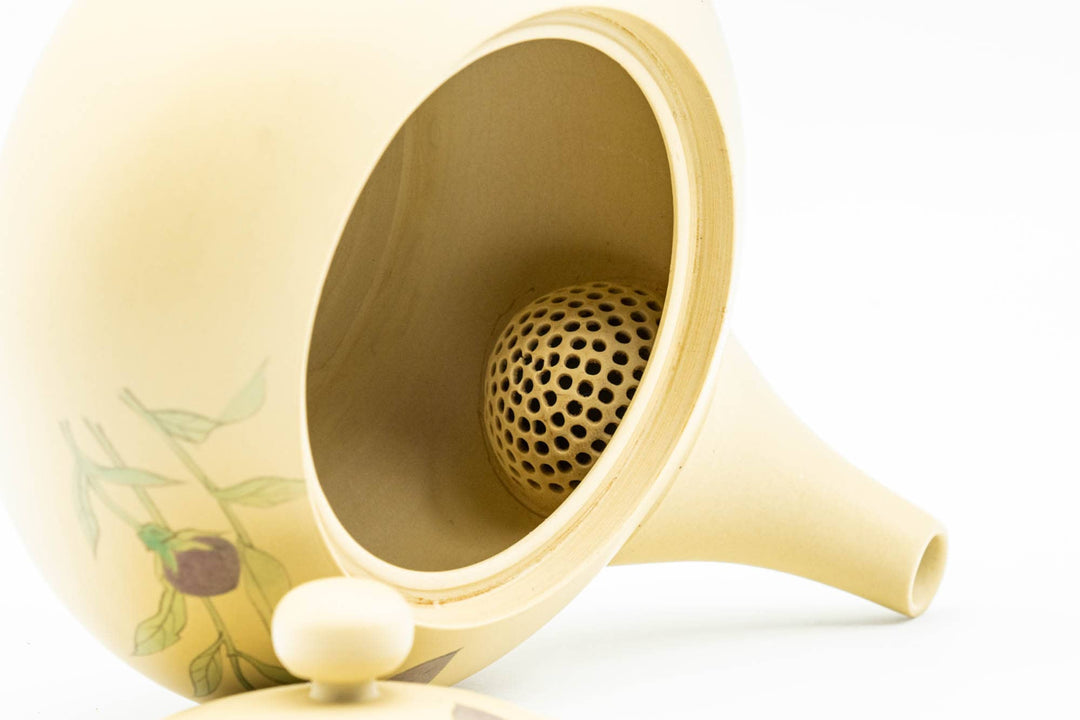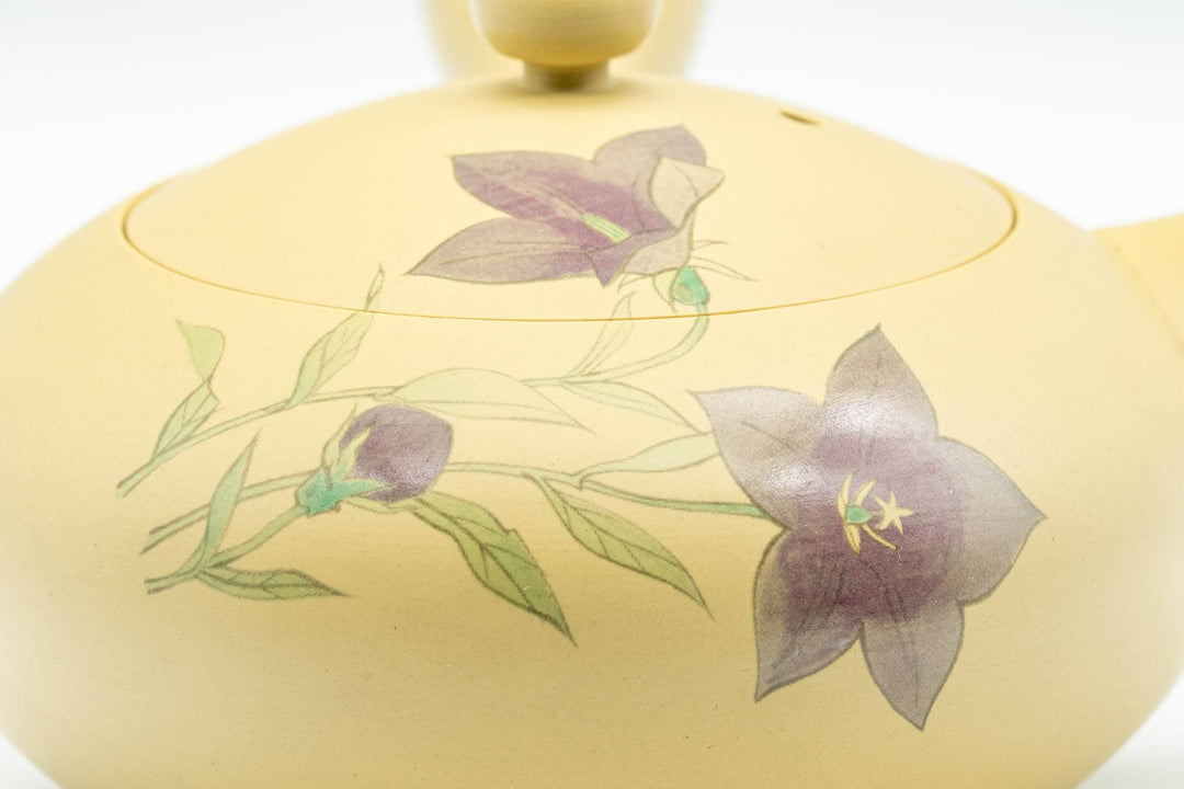 This elegant ivory hiramaru-gata Tokoname-yaki kyusu (teapot) is accented with delicate purple kikyo flowers (桔梗 - Chinese Bellflower). Compared to a steel mesh filter, its ceramic debeso (half-spherical) filter is perfect for naturally straining the tea.