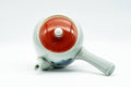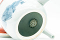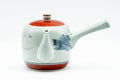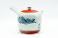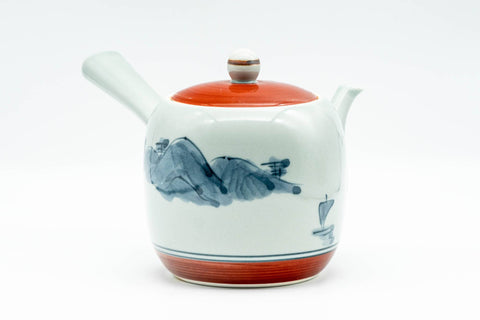 This Arita-yaki kyusu (teapot) features a finely made curved spout, with its body and lid decorated with blue mountainous motifs and red trim. Its built-in ceramic debeso filter is perfect for naturally straining tea.