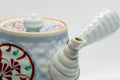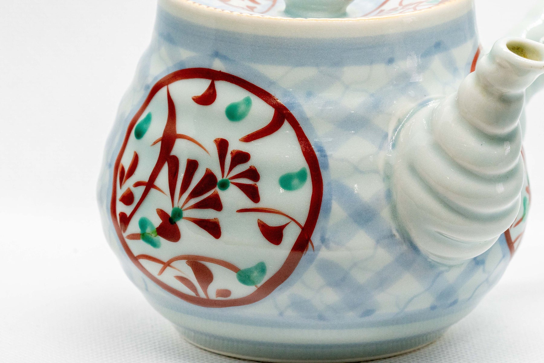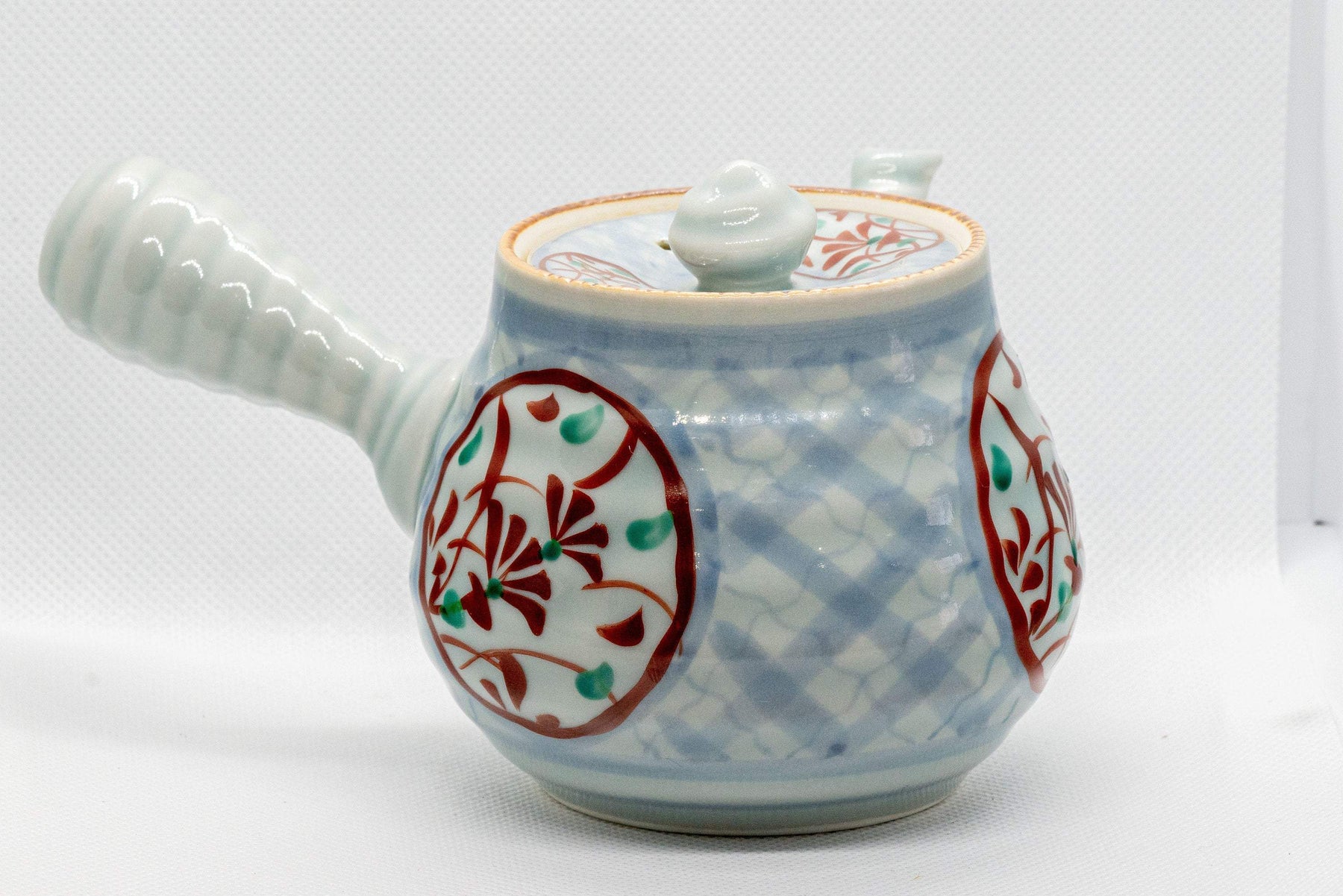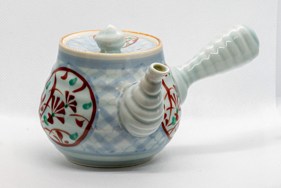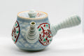 Vintage Porcelain Kyusu (teapot) with a ceramic debeso (half-sphere) strainer which won't impart a metallic taste to your tea. This kyusu is a beautiful sky blue and white colour, decorated with red and green traditional designs.
