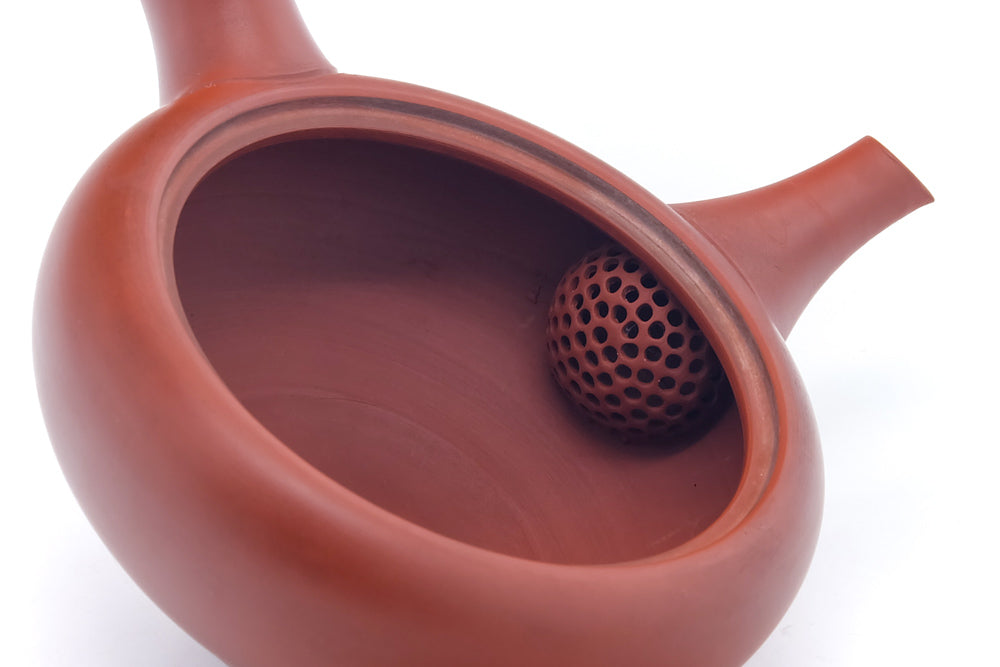 This tiny Tokoname-yaki kyusu (teapot) is expertly made from smooth red shudei clay. Its built-in ceramic debeso filter is perfect for naturally straining tea.