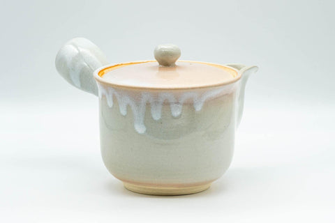 This Hagi-yaki kyusu (teapot) is made like a houhin, meaning that it has a wide, triangular open spout which allows for fast pouring, a simple ceramic do-ake filter which lends no metallic taste to the tea, and a wide opening which allows for easy viewing of the tea leaves and easy cleaning. This kyusu is made from a warm, orange-hued stoneware with white drip glazing. Made by Tsubaki Kiln (椿窯, stamped 天鵬山).
