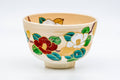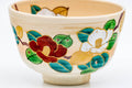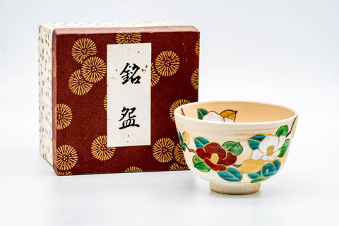 This Kyo-yaki chawan (matcha bowl) features an inviting warm glaze and is decorated with red and white tsubaki (camellia) flowers.
