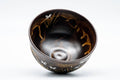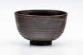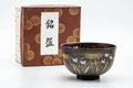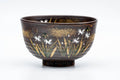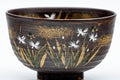 This Kyo-yaki chawan (matcha bowl) features a dark brown glaze decorated with an elegantly painted floral scene.