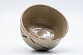 This Karatsu-yaki chawan (matcha bowl) features a crazed warm-grey glaze with subtle iron spotting, decorated with iron underglaze paintings of grass in the e-Karatsu style.