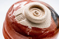 This Aka-raku chawan (matcha bowl) features a pronounced waisted shape and is covered in a bright red glaze with patches of black. The foot is left unglazed showing off the true colour of the clay.