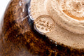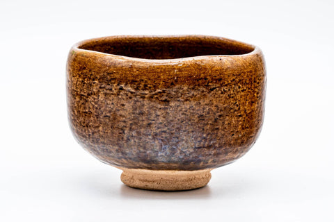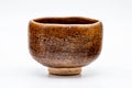 This handbuilt raku chawan (matcha bowl) features a lustrous burnt sienna 'candy glaze' with subtle variations. Candy glaze, or 'ame-yu' (飴釉) in Japanese, is a high-iron glaze known for its delightful variations and unevenness in colour and texture, getting its name from its overall caramel colour. Early examples of this glaze style date back to the Kamakura period.