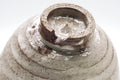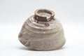 This exquisite Hagi-yaki chawan (matcha bowl) features an Ido-style shape with a tall bamboo node-shaped foot (竹の節高台 - takenofushi koudai) with the typical Hagi-yaki notch cut into it. Atop the iron-rich clay, this chawan sports a milky white glaze with lovely crazing (貫入 - kannyuū). The koshi (腰 - lower back) of the bowl has a subtle spiraled shape with gentle rokurome (ろくろ目 - potters' wheel marks) which shows the flow of the potter's fingers as they shaped the piece on the wheel.