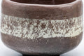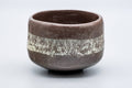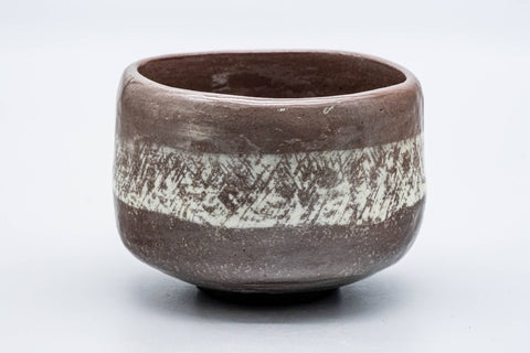 This unique raku chawan (matcha bowl) features a classic shape with a warm brown-grey glaze, accented by an obi (帯- belt) of white slip, etched with intersecting diagonal lines in a grafitto style.